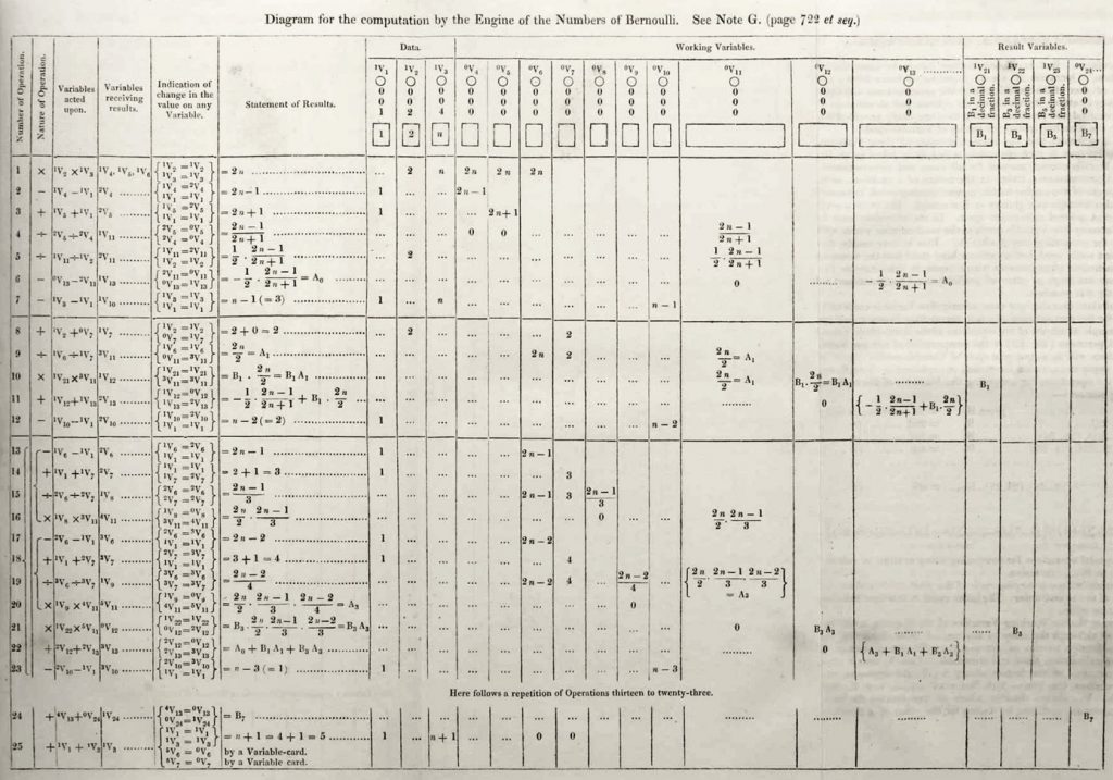 Ce n’est qu’après la publication de 1843 que Charles Babbage propose à Ada Lovelace de compléter cette première base (descriptive) par des notes et des compléments. Les deux scientifiques travaillent alors ensemble à la production de 7 notes (labélisées de A à G), bien plus volumineuses que l’article initial. La note G, décrit dans le détail un processus de calcul des nombres de Bernoulli imputable sur la calculatrice. C’est la première fois de l’Histoire que l’on décrit un algorithme dans un langage destiné à être exécuté par une machine et – de fait – le premier programme informatique.