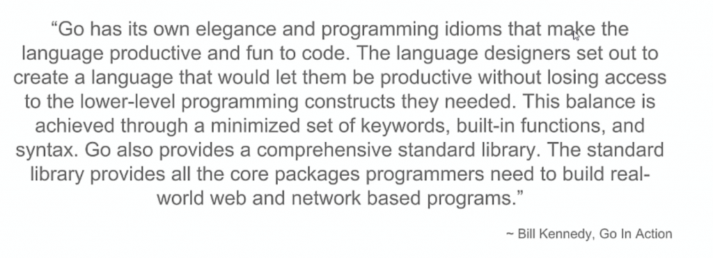 It also aims to be modern, with support for networks and multicore computing. Google designed it according to their needs. As they have thousands of contributors to the same code base, they had in mind to enable that one segment of the code has minimum side effect on another segment. Thus, many features of modern OOP languages have been left out like inheritance, classes, constructors, annotations. This makes code easily maintainable and easy to modify, preventing side effect. Nevertheless, some may not appreciate this changes which make GO quite different from classical OOP languages. The bright side is that syntax of GO remained the same since its release 1.0 in 2012, making the syntax stable and backward compatible.
