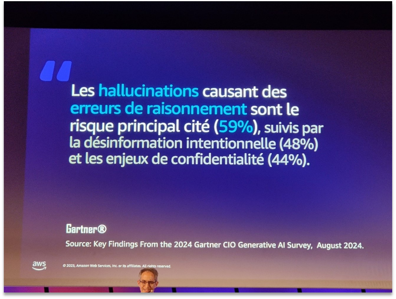 Avec l’adoption massive de la GenAI, la sécurité et la fiabilité de ces systèmes sont devenues des préoccupations majeures. D’après une étude Gartner citée lors du Summit, la principale crainte des DSI concernant les LLM est le problème des hallucinations (59 % d’entre eux la citent comme risque n°1) – c’est-à-dire ces réponses inventées par le modèle pouvant causer des erreurs de décision. Viennent ensuite les risques de désinformation intentionnelle (48 %) et de confidentialité des données (44 %). Conscient de ces enjeux, AWS a dédié plusieurs sessions aux bonnes pratiques de sécurisation des applications d’IA générative.